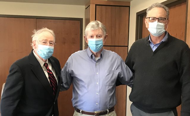 Douglass Sullivan-Gonzalez (right), dean of the UM Sally McDonnell Barksdale Honors College, congratulates Vaughn Grisham (left) and John Winkle on having their names attached to facilities and programs at the Honors College by a recent donation. Both retired professors significantly influenced an anonymous donor through their teaching and mentoring. Photo by Anthony Heaven/UM Development