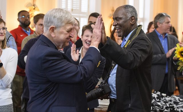 Dewey Knight (left), former associate director for the Center for Student Success and First-Year Experience at Ole Miss, gives a high-five to Don Cole, retired assistant provost and associate professor of mathematics, at Knight’s 2018 retirement reception. Knight’s contributions are being honored with a scholarship that will continue his work of helping students. Photo by Thomas Graning/Ole Miss Digital Imaging Services