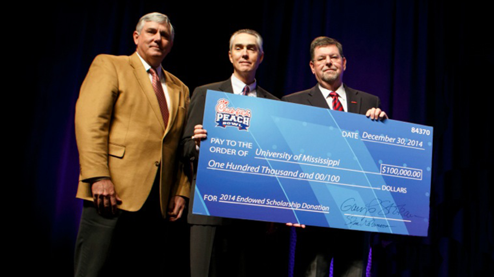 OXFORD, Miss. – The Chick-fil-A Peach Bowl has made a $100,000 gift to the University of Mississippi for scholarships, continuing an eight-year tradition of charitable and scholarship contributions by the organization.