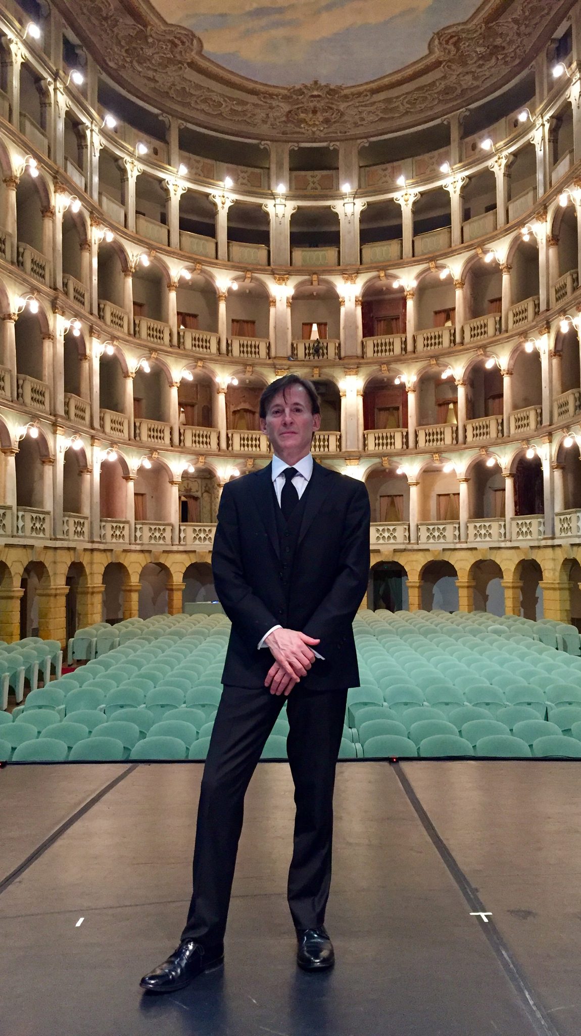 Concert pianist Bruce Levingston, holder of the UM Fant Chair and Chancellor’s Honors College Artist-in-Residence, stands onstage at the Teatro Fraschini di Pavia in Italy, one of the theaters where he performed with renowned ballerina Alessandra Ferri and Herman Cornejo, star principal of American Ballet Theatre. Photo by H. Cornejo