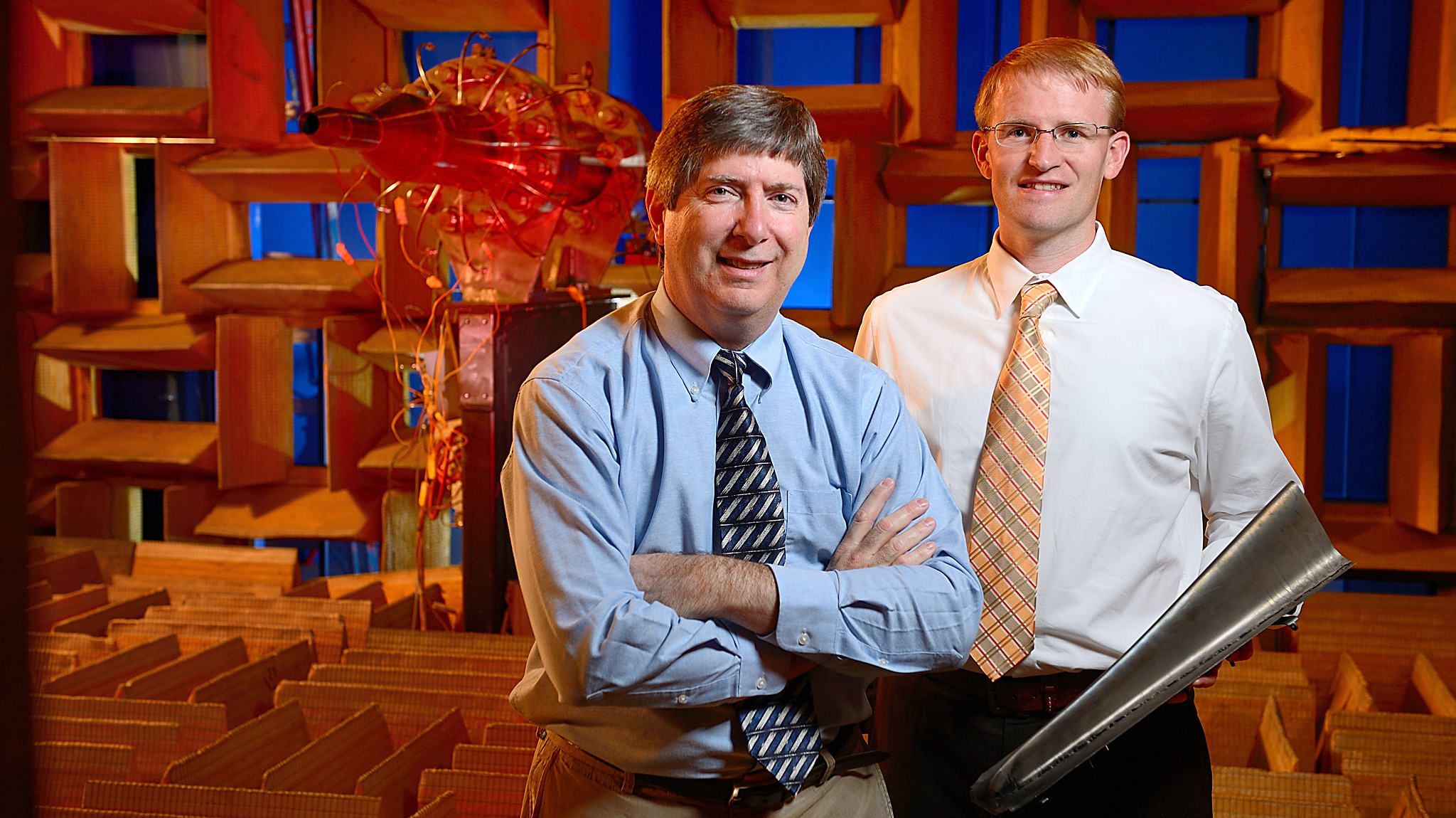 Bernard Jansen (left), a senior research and development engineer, and research scientist Nathan Murray examine an inner seal for a jet nozzle in the Anechoic Jet Laboratory at the National Center for Physical Acoustics. UM photo by Robert Jordan.