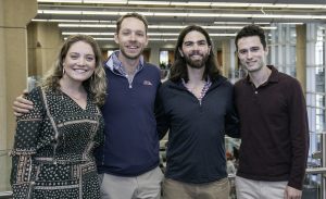 UM alumni and Cursty founders Clara Agnes Ault (left), William Ault, Eli Allen and David Oates gather for a photo after a breakfast meet-and-greet session with Ole Miss students and staff from the university’s Center for Innovation and Entrepreneurship. Photo by Joe Worthem/J. Worthem Photography and Design