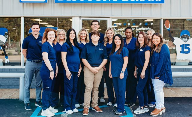 Lee Griffin (left) is working to make health care more accessible to customers at Iuka Discount Drugs, where he started working as a high school student. After buying the business in 2020, he and his staff have been working to provide more clinical services at the pharmacy. Submitted photo