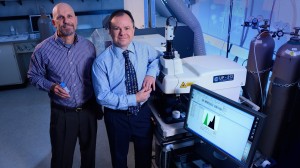 University of Mississippi professors Gregg Davidson (left), geology and geological engineering, and James Cizdziel, chemistry and biochemistry, in Cizdziel's inductively coupled plasma mass spectrometry laboratory. UM photo by Robert Jordan.