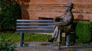 This bronze statue of William Faulkner near City Hall is a popular attraction for Faulkner enthusiasts visiting Oxford. Photo by Robert Jordan/Ole Miss Communications.