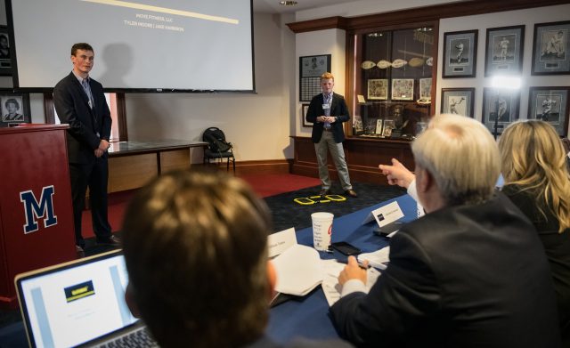 UM students Jake Harrison (left) and Tyler Moore explain their concept for Move Fitness to judges at the 2019 Gillespie Business Plan Competition. Move Fitness went on to win the competition’s top prize. Organizers are accepting applications through March 28 for this year’s Gillespie competition, which offers cash prizes, mentoring and other services to student entrepreneurs. Photo by Megan Wolfe/Ole Miss Digital Imaging Services