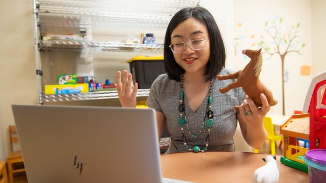 Ying Hao, an assistant professor of communication sciences and disorders, demonstrates teletherapy for children through the Speech and Hearing Center in the Department of Communication Sciences and Disorders. Photo by Kevin Bain/Ole Miss Digital Imaging Services