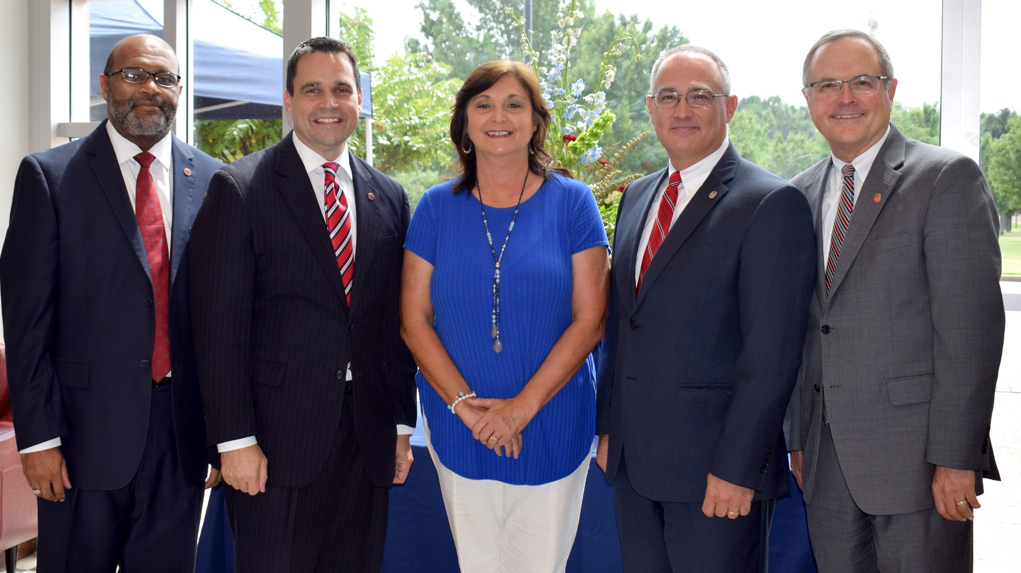 Officials from the University of Mississippi and Northwest Mississippi Community College gather at the DeSoto Center campus in Southaven to introduce the new Path 4 partnership to aid local students as they work toward their college degrees close to home. Joining the signing event are (from left) Keith Reed, Northwest-DeSoto Center dean; NMCC President Michael Heindl; Lee Caldwell, DeSoto County supervisor; UM Interim Chancellor Larry Sparks; and Rick Gregory, UM assistant provost for regional campuses and DeSoto Center director. Photo by Pam Starling/UM Division of Outreach and Continuing Education