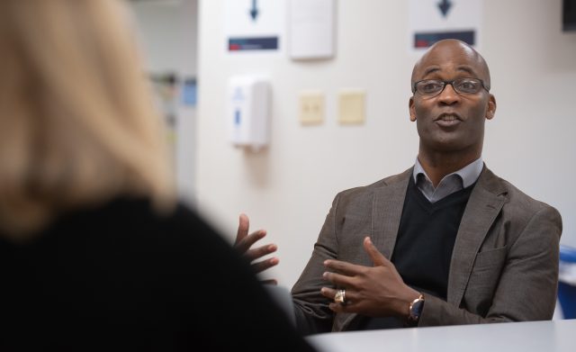 Morris spent much of Thursday (Nov. 4) meeting with campus groups. The 2000 UM graduate, who was in Army ROTC as a student, quickly noted that he is fully vaccinated and is quick to tell others his status.