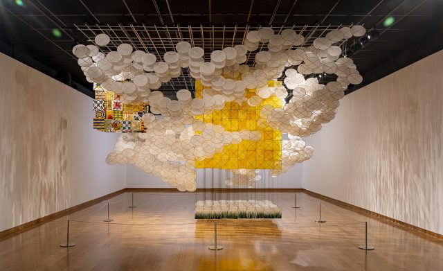 Within “The Other Sun,” the artist’s exhibit at the museum, thousands of small, simple kites hang from the ceiling. Together, however, these jungles of paper pieces meld into sweeping abstracted landscapes.