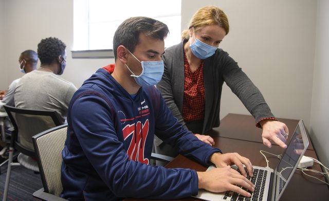 Nick Ramsey (left), a first-year Ole Miss athletic training student from Chesapeake Bay, Virginia, trains on the concussion education module with Heather Landry Shirley, assistant professor and program director of athletic training. Photo by Thomas Graning/Ole Miss Digital Imaging Services