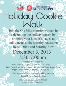 OXFORD, Miss. – University of Mississippi sororities will host a Holiday Cookie Walk on Tuesday (Dec. 3) for the campus, Oxford and Lafayette County communities. Starting at 5:30 p.m., local families can take their children to visit recently decorated chapter houses on Rebel Drive and Sorority Row. Each house will have a table on itsRead the story …