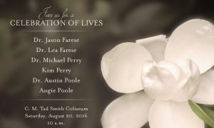 OXFORD, Miss. – Celebration of Lives, a memorial service for the six members of the Oxford community who died in a plane crash this past Sunday, is scheduled for 10 a.m. Saturday (Aug. 20) at the C.M. Tad Smith Coliseum on the campus of the University of Mississippi. Three local couples – Dr. Jason Farese andRead the story …
