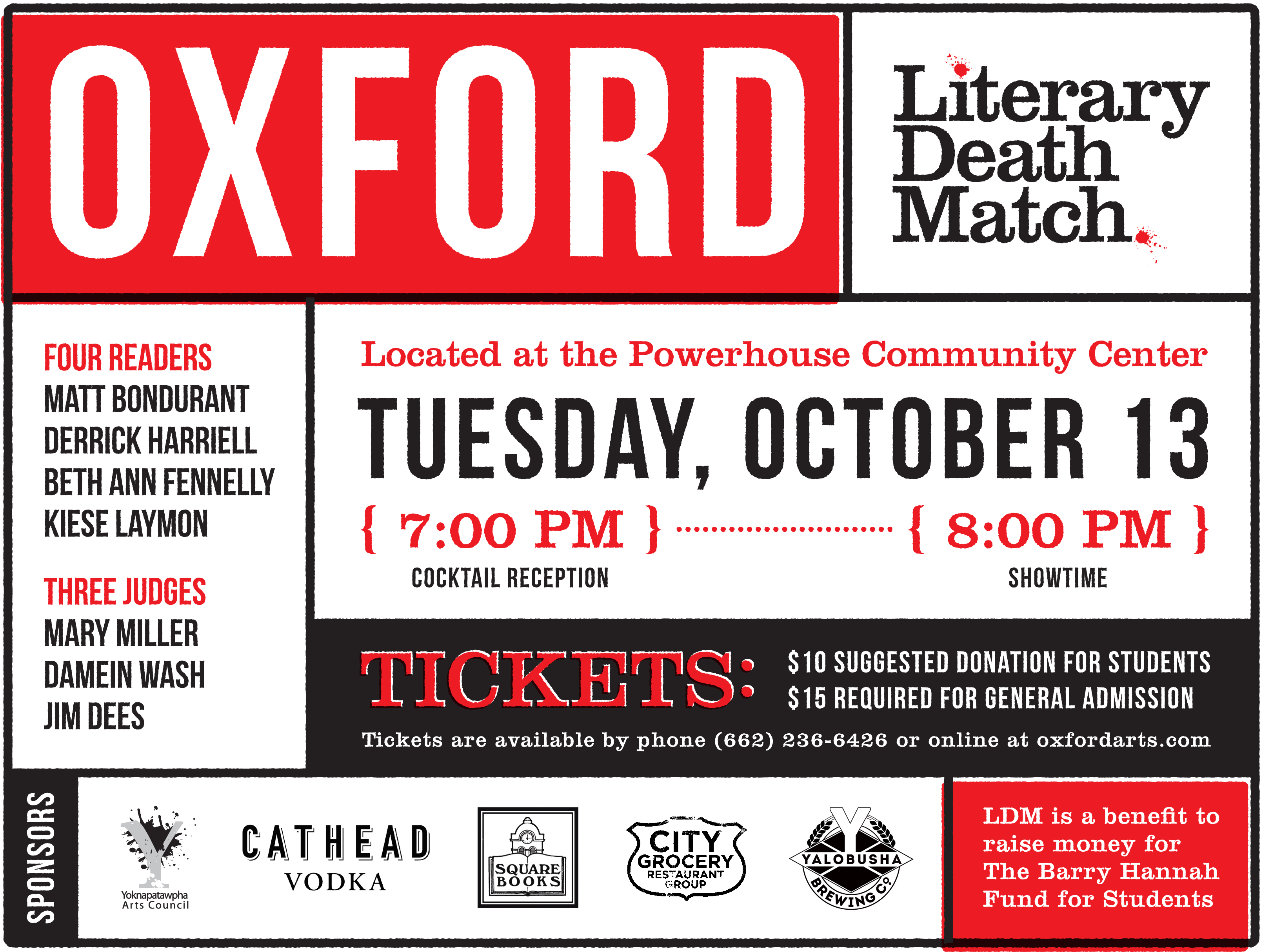 posterOXFORD, Miss. – Faculty members of the University of Mississippi Department of English will compete in the first-ever Oxford rendition of a Literary Death Match on Tuesday (Oct. 13) at the Powerhouse in Oxford.