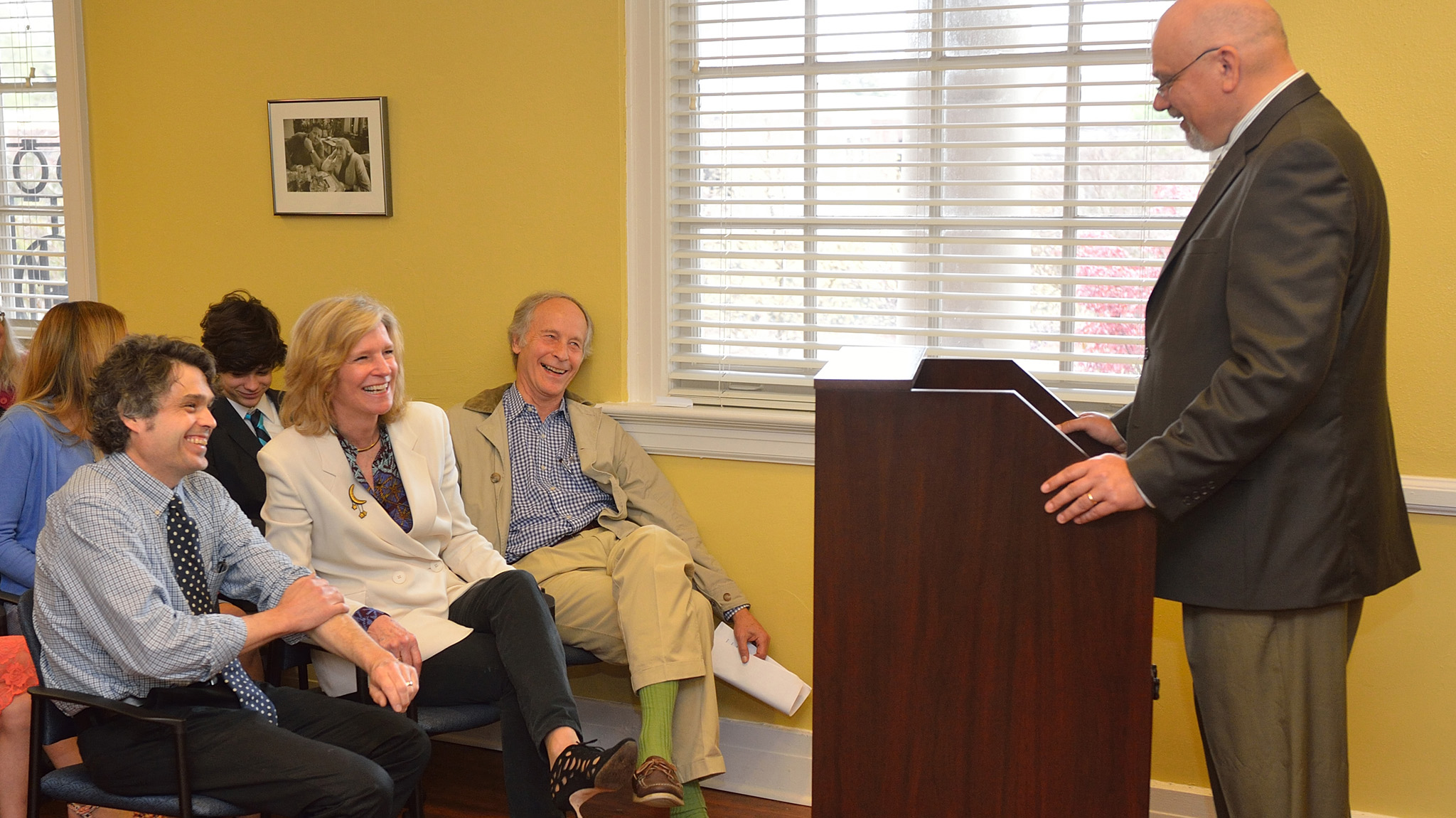 Honorees (seated, from left) Barry 'Po' Hannah Jr., Kristina Ford and Richard Ford listen to Ivo Kamps (standing), University of Mississippi chair and professor of English, share reflections during the dedication of the Hannah-Ford Room for Creative Writers on Thursday. UM photo by Robert Jordan.