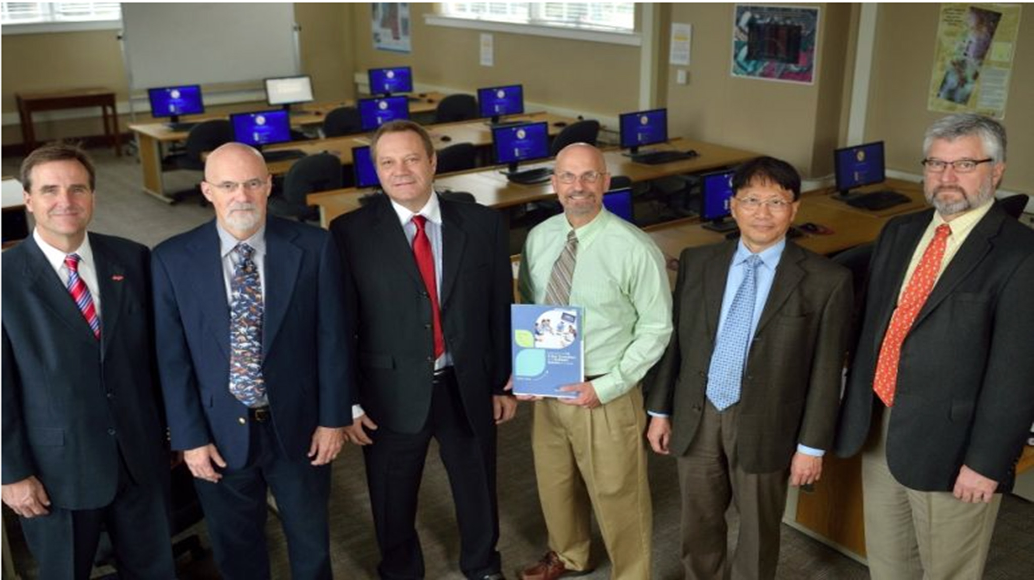 Sam Loree (third from left), CEO of Beicip, Inc. in Houston, Tx., is thanked by UM representatives for a recent gift of sophisticated software designed for geological research and oil and gas exploration. Also pictured, from left: Kevin Gardner, UM Foundation development director for Engineering; Louis Zachos, professor of Geology and Geological Engineering; Gregg Davidson, chair and professor of Geology and Geological Engineering; Alex Cheng, dean of the School of Engineering; Greg Easson, director of the Mississippi Mineral Resources Institute and professor of Geology and Geological Engineering.
