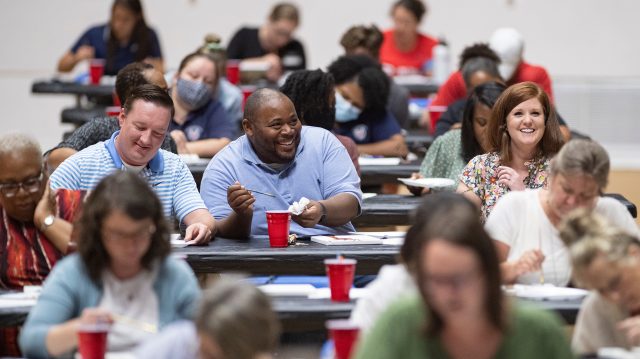 UM staff members participate in a painting class during Staff Appreciation Week. The university was recognized in the annual ‘Great Colleges to Work For’ list in categories such as Faculty and Staff Well-Being, Diversity, Inclusion and Belonging, and Mission and Pride. Photo by Logan Kirkland/Ole Miss Digital Imaging Services