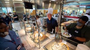 Chancellor Glenn Boyce (center) serves breakfast to Ole Miss staff members during Staff Appreciation Week. Photo by Kevin Bain/Ole Miss Digital Imaging Services