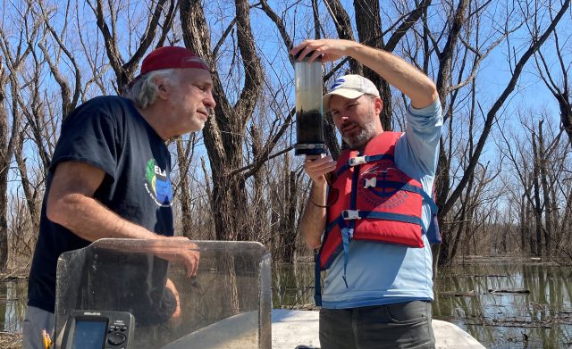 UM biology professor Cliff Ochs (left) and Jason Taylor, research ecologist at the National Sedimentation Laboratory, examine a tube of sediments from the bottom of Desoto Lake in April. The lake is in the Mississippi River floodplain, and the research team uses these samples to measure nitrogen cycling in the floodplain. Photo by Doug Shields Jr./Shields Engineering