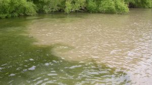 Lake water (left), rich in green algae, mixes with brown river water in a Mississippi River backwater. This interaction illustrates the differences in biological production of the two types of habitats. Submitted photo