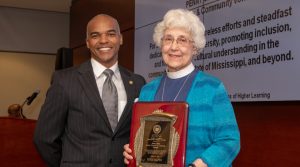 Dr. Steven Cunningham (left), chair of the IHL Diversity Committee, congratulates retired educator Peggy Sisson on being honored with the board’s Karen Cummins Community Service Award. Photo courtesy IHL
