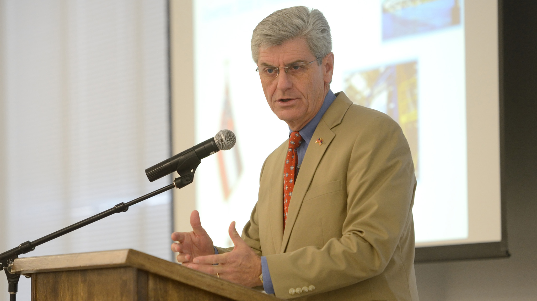 Mississippi Gov. Phil Bryant discusses the critical role of an educated workforce in attracting high-tech jobs to the state Tuesday at the University of Mississippi's Center for Manufacturing Excellence. UM photo by Kevin Bain.