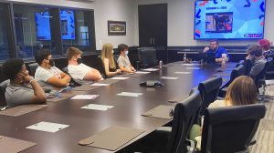 Ole Miss Esports program coordinator Jimmy Palmer (at end of table) and students conduct a team meeting. They have held meetings in various locations around campus, but a recent gift from the Payne family will provide a dedicated space for the esports program in Yerby Hall. Photo courtesy Ole Miss Esports