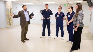 Chad Hunter (left), associate university architect, takes UM nursing students Piercen Burchfield, Katelyn Hazelgrove and Charles Gill, along with Eva Tatum, assistant professor in the School of Nursing, through the school’s new space at the South Oxford Center. This room will become a 60-student classroom. Photo by Joe Ellis/UMMC