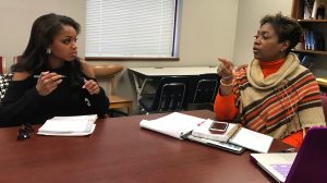 Asya Branch (left), president of Serving Children of Incarcerated Parents, discusses plans for the new UM student organization’s inaugural meeting with Deetra Wiley, SCIP adviser. Submitted photo