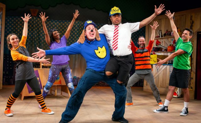 Half-canine and half-policeman Dog Man (center) works to save the world from an evil cat and a cyborg fish in ‘Dog Man: The Musical,’ coming to the Ford Center for a matinee performance on Feb. 12. Photo by Jeremy Daniel