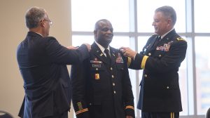 Col. Kelvin Nichols receives his pins from UM Interim Chancellor Larry Sparks and Maj. Gen. Janson Boyles as he is promoted to colonel in service of the Mississippi Army National Guard in the Ole Miss Student Union ballroom. Nichols has more than 29 years of military service and serves as the commander of the 168th Engineer Brigade based in Vicksburg. Photo by Thomas Graning/Ole Miss Digital Imaging Services