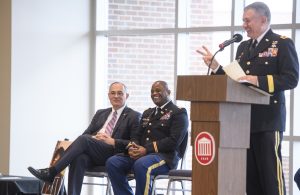 UM Interim Chancellor Larry Sparks (left) and Col. Kelvin Nichols laugh as Maj. Gen. Janson Boyles shares a story about Nichols’ military career during a ceremony to promote Nichols to colonel. Photo by Thomas Graning/Ole Miss Digital Imaging Services