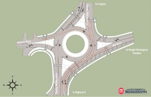 OXFORD, Miss. – The roundabout at the Chucky Mullins Drive entrance to the University of Mississippi campus opened to traffic beginning Friday afternoon (Aug. 11).