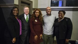 Keynote speaker Clint Smith (second from right) is welcomed to the UM campus by (from left) Shawnboda Mead, director of the Center for Inclusion and Cross Cultural Engagement; Chancellor Jeffrey Vitter; Nekitta Beans, Black Student Union president; and Katrina Caldwell, vice chancellor for diversity and community engagement. Photo by Thomas Graning/Ole Miss Communications