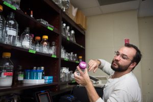 Weston Aron works in a University of Mississippi biology lab feeding cloned fruit flies. Aron, whose promising academic career at a major university was derailed by drugs, alcohol and arrests, is sober and working hard on his degree at Ole Miss. Photo by Megan Wolfe/Ole Miss Digital Imaging Services