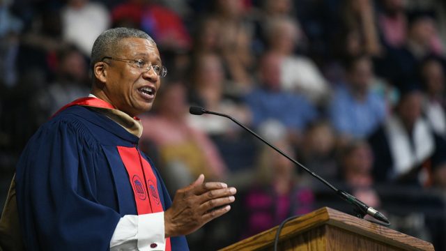 Retired Maj. Gen. Augustus Leon Collins delivers the commencement address Saturday (May 11) at the University of Mississippi’s 166th Commencement. Collins, former commanding general of the Mississippi National Guard and president of the Ole Miss Alumni Association, addressed a crowd of approximately 12,000 people in The Pavilion at Ole Miss. Photo by Kevin Bain/Ole Miss Digital Imaging Services