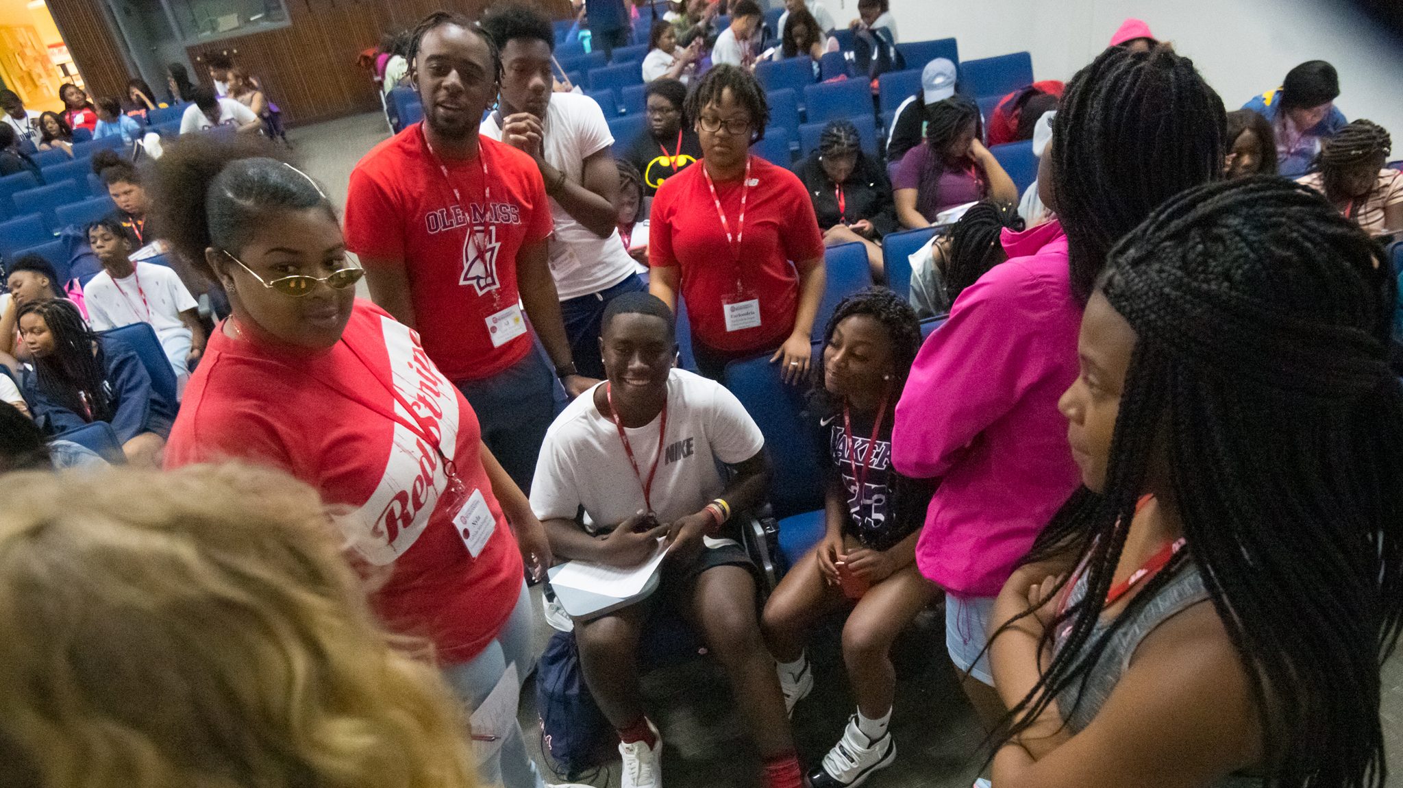 High school participants in the 2019 Mississippi Outreach to Scholastic Talent Conference at the University of Mississippi prepare for a team-building exercise. Photo by Kevin Bain/Ole Miss Digital Imaging Services