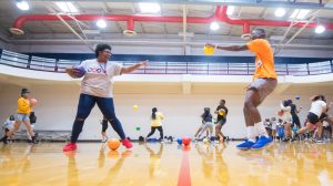 Participants in the 2019 Mississippi Outreach to Scholastic Talent Conference play dodge ball as part of a team-building exercise. Photo by Kevin Bain/Ole Miss Digital Imaging Services
