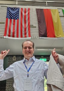 Oliver Dinius, executive director of the Croft Institute for International Studies, poses with American and German flags at the Fu Jen International Student Office at Fu Jen Catholic University in Taiwan. Dinius, who grew up in Germany, used his 2020-21 Fulbright IEA award to visit universities that could become study abroad locations for Ole Miss students. Submitted photo
