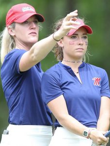 Coach Kory Henkes (left) works with Ole Miss Rebels golfer Kennedy Swann. Photo by Josh McCoy/Department of Intercollegiate Athletics
