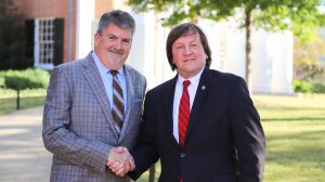 Barry Atkins (left), managing director of Deloitte & Touche LLP and a UM accountancy graduate, visits with Mark Wilder, dean of the Patterson School of Accountancy, on the Ole Miss campus. Deloitte and its foundation have funded a $1.5 million named chair in the school. Photo by Kirsten Simpson/UM Development