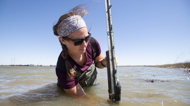 Victoria Simek, a technician for the Water Quality and Ecological Unit of the U.S. Department of Agriculture’s Agricultural Research Service, conducts water sampling in the Mississippi Delta for the Farmer to Farmer migratory shorebird project. UM biologist Jason Hoeksema will discuss the efforts as part of his Science Cafe presentation April 19 at Heartbreak Coffee in Oxford. Photo by Logan Kirkland/ Ole Miss Digital Imaging Services