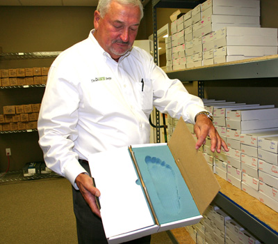 Robert Salmon displays a mold cast by one of The Diabetic Shoppe's pedorthists. A technician will use the mold to customize footwear for a diabetic patient.