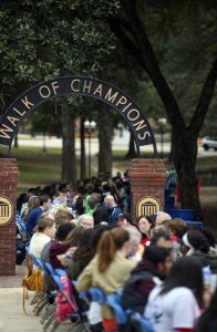 The free university event stretched across the Grove, where hundreds gathered to eat hamburgers and hot dogs and get to know one other better. Organizers said the continuous table – really, 50 tables placed end-to-end – is a powerful visual, where everyone has a place, and participants are arranged as part of one community along the Walk of Champions