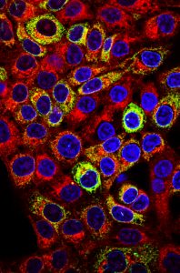 In this image, cancer cells are being used to test investigational drugs. The green is staining a target in the cells that causes cancer cells to grow, and the drug shows up as red. Biomedical engineer Thomas Werfel is working to develop biomaterials that can harness human immune cells to improve the accuracy and effectiveness of vaccines and cancer treatments. Submitted photo