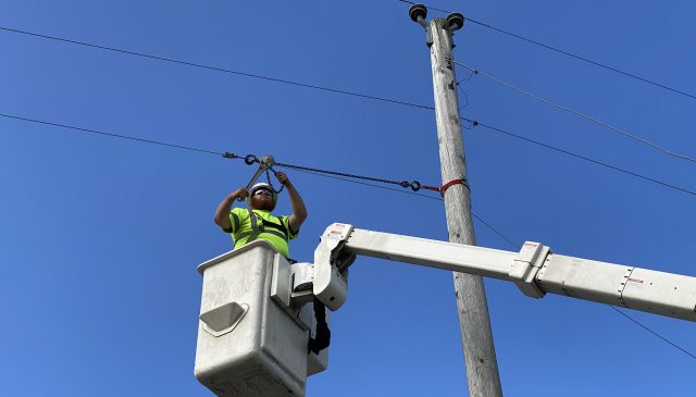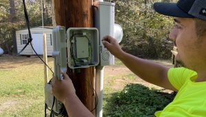 National OnDemand technician Dustin Ewing installs and tightens strand wire to anchor fiber as part of North East Mississippi Electric Power Association’s broadband fiber-to-the-home project. (Submitted photo)