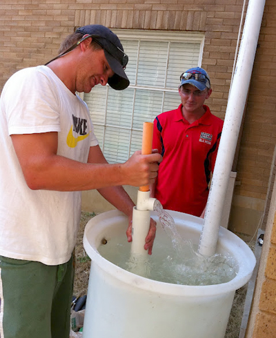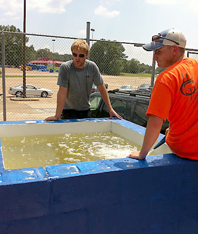 University of Mississippi engineering students Alan Barger (left) and Jimmy Jackson designed and built a manual pump as a possible tool to use in the field in Togo. They tested the pump in Oxford to be sure their design can raise water 90 feet, which is the depth of water in open wells in the area of Togo where the Engineers Without Borders-Ole Miss group anticipates working.