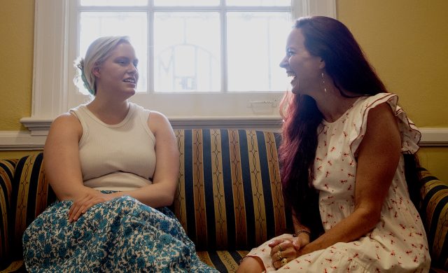 Ole Miss doctoral student Ellie Black (left) and English professor Beth Ann Fennelly share a laugh as they discussed their award-winning entries in the Wergle Flomp Humor Poetry Contest. The Oxonians placed second and first, respectively, in the national competition. Photo by Thomas Graning/Ole Miss Digital Imaging Services