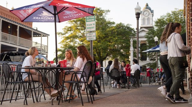 Ole Miss students enjoy al fresco dining on the Oxford Square. ESPN has named Oxford as the country’s top college town. Photo by Logan Kirkland/Ole Miss Digital Imaging Services