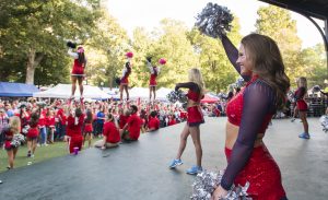 Cheerleaders pump up the crowd from the Grove Stage during pre-game festivities before the Ole Miss Rebels’ 2019 matchup with Texas A&M. Photo by Christian Johnson/Ole Miss Digital Imaging Services